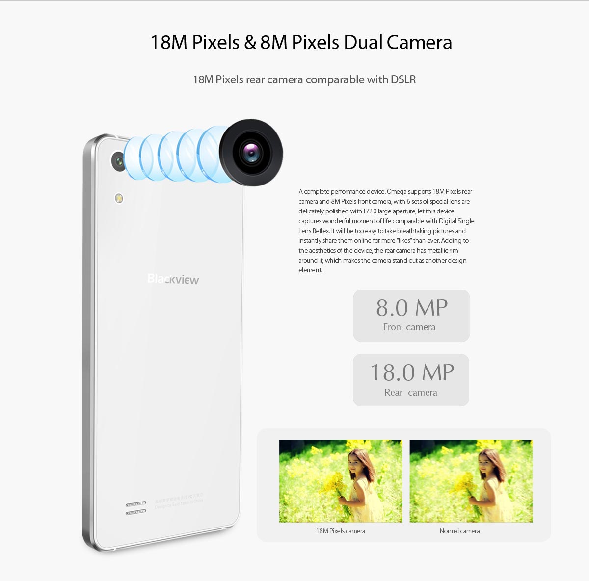 Аппарат считается имиджевым, т. к. обладает плоским строением, рамками из металла и немного закругленными углами. Обе поверхности покрыты защитными стеклами Gorilla. Что касается цветов, то здесь есть варианты — белый, черный или золотистый. Разрешение 5-ти дюймового дисплея составляет 1920x1080 пикселей, что обеспечивает картинку достойного качества. Емкость аккумулятора blackview omega составляет 2500 мАч, это объясняется достаточно тонким корпусом гаджета — 7,8 мм. Камеры находятся на достойном среднем уровне — 8 Мп и 18 Мп, но имеется функция интерполяции. Несмотря на свою новизну, blackview omega купить можно уже сегодня на нашем сайте.